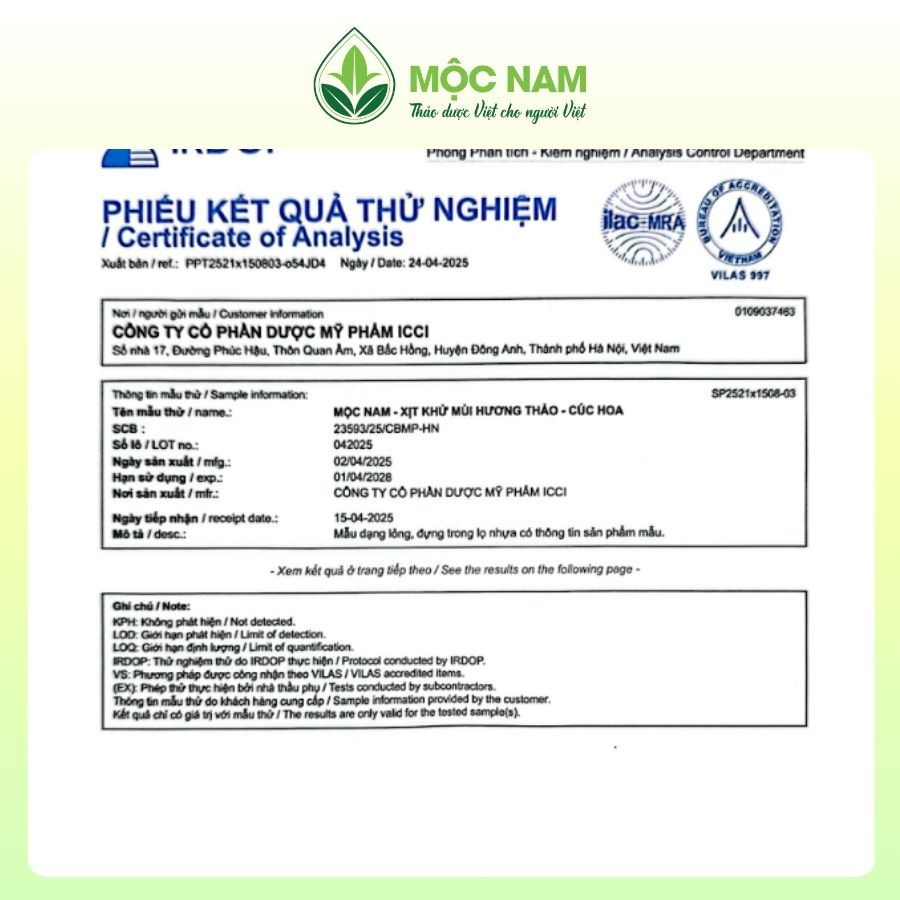 Với thành phần chính bao gồm hương thảo chiết CO2 siêu tới hạn cùng Cúc hoa, Aluminum Chlohydrate và các loại thảo dược khác, xịt khử mùi Mộc Nam giúp ngăn tiết mồ hôi hiệu quả, diệt khuẩn và ngăn ngừa vi khuẩn phát triển, khử mùi nhẹ nhàng giúp bạn khô thoáng tự tin suốt 24h.